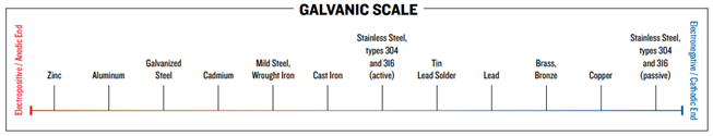 The relationship between metals on the Galvanic Scale is a useful guide for selecting metals that will be joined to minimize a ‘galvanic interaction’. Generally, materials that are farther apart on the Galvanic Scale have a higher risk of galvanic corrosion. Using this information and incorporating into the design can reduce the risk of galvanic corrosion. The further apart one metal is from another metal on the scale, the greater the corrosion will be. Conditions can also play a role in accelerating corrosion. Generally, water, and especially salt water, serve as the conductive path between two metals. It is critical to keep dissimilar metals separated in wet conditions.